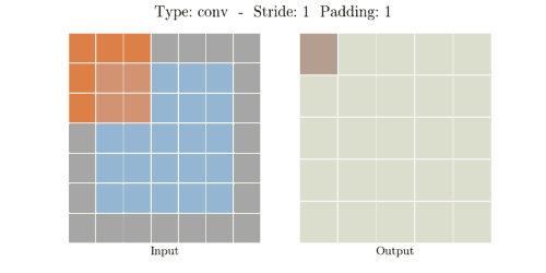 합성곱 오토인코더의 인코더 부분에서는 convolutional layer가 사용된다. 일반적인 합성곱 연산은 아래와 같이 진행된다. 일반적인 convolution layer에서 input,kernel,padding,stride를 i, k, p, s라고 할 때, output 한변의 길이 o는 아래와 같이 정해진다.