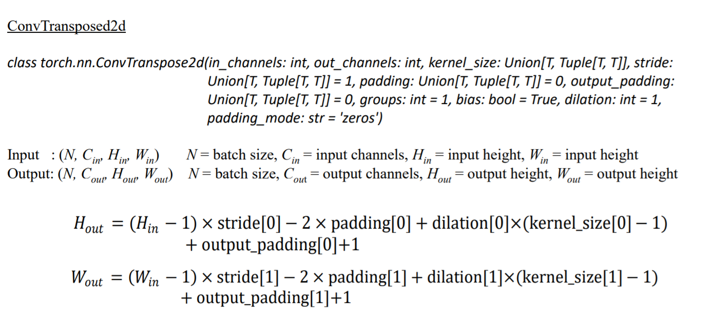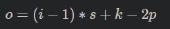 input, kernel, padding, stride 의 i, k, p, s가 주어졌을때 output 한변의 길이 o는 아래 공식으로 계산된다.