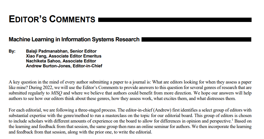Padmanabhan, B., Sahoo, N., & Burton-Jones, A. (2022). Machine Learning in Information Systems Research. Management Information Systems Quarterly, 46(1), iii-xix.