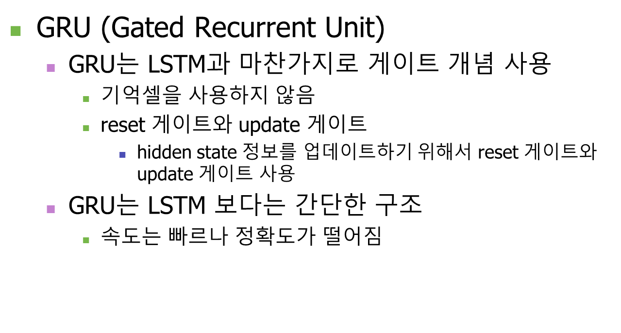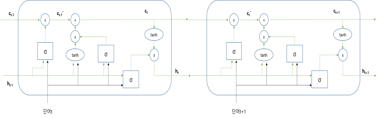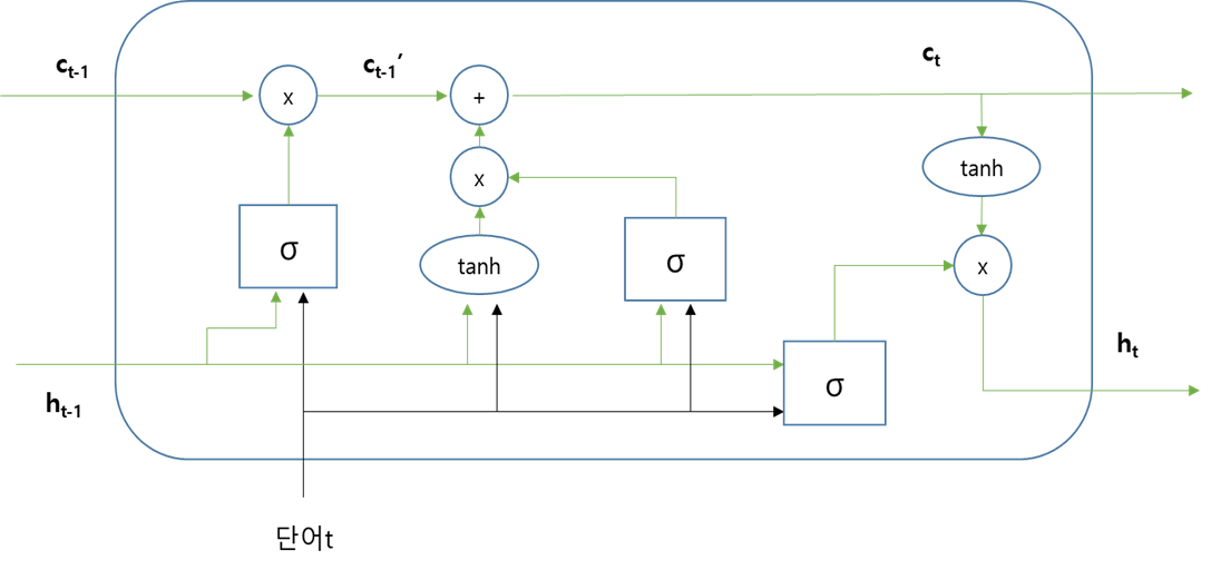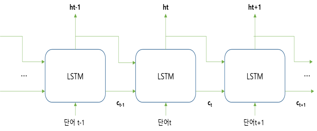 RNN이 가지는 장기의존문제를 개선하기 위해서 LSTM은 기억 셀(memory cell)을 추가한다. 기억 셀에는 입력/망각/출력 게이트가 추가되는데 이를 통해서 이전 단어의 정보를 더 잘 반영하고 멀리 떨어져 있는 단어들의 정보를 보다 잘 학습할 수 있다.
