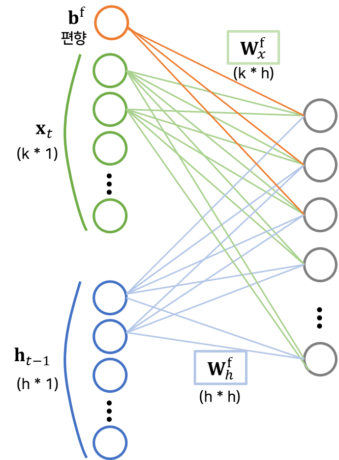ht-1 : 이전 단계에서 LSTM 층이 전달하는 Hidden state vector, 기억셀의 원소 수와 동일한 h 개의 노드 가짐. (1 x h 형태)