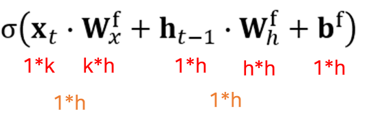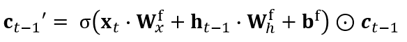 1xh 벡터에 시그모이드 함수를 적용하면 각 원소에 대해서 시그모이드 함수가 적용된다. 여기에 ct-1을 아마다르 곱하기하면 위에서 본 식으로 표현할 수 있다. (아마다르 곱셉은 같은 위치의 원소끼리의 곱셈을 의미한다)