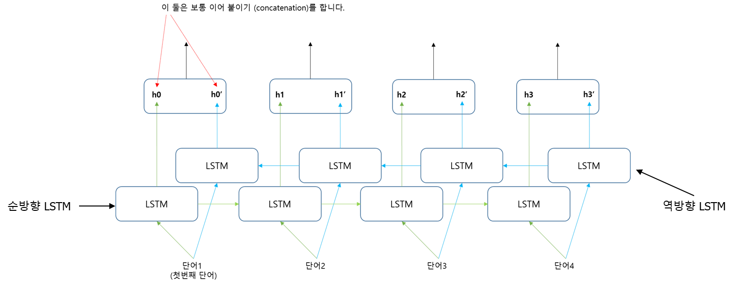 일반적인 LSTM은 순방향(왼쪽에서 오른쪽)으로 정보를 추출하지만 역방향의으로도 정보를 추출해서 이용할 수 있다. 이를 양방향 LSTM이라고 한다. 일반적으로 양방향 LSTM을 사용할 경우 시퀀스 데이터에서 더 많은 정보를 추출할 수 있기 때문에 성능이 더 좋게 나타난다.