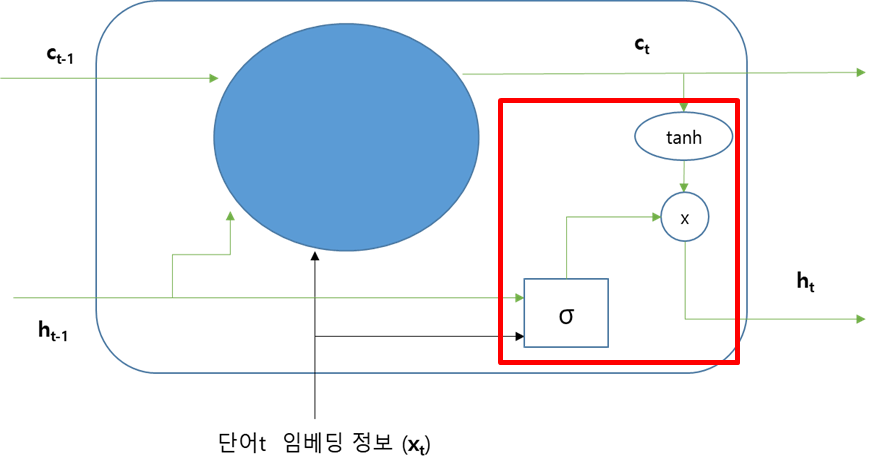 output gate에서는 forget, input gate를 지나서 업데이트 된 기억 셀 ct를 이용해서 LSTM 층의 최종 출력 값인 ht를 계산한다.