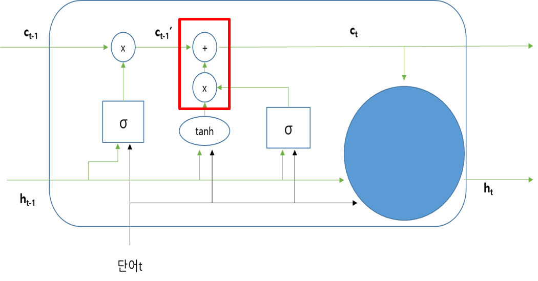 forget 게이트를 통과해서 중요하지 않은 정보가 삭제된 Ct-1' 벡터에 대해서 새로운 정보를 추가하는 역할을 한다. 크게 탄젠트 함수 부분과 시그모이드 함수 부분 두 가지로 구성된다.