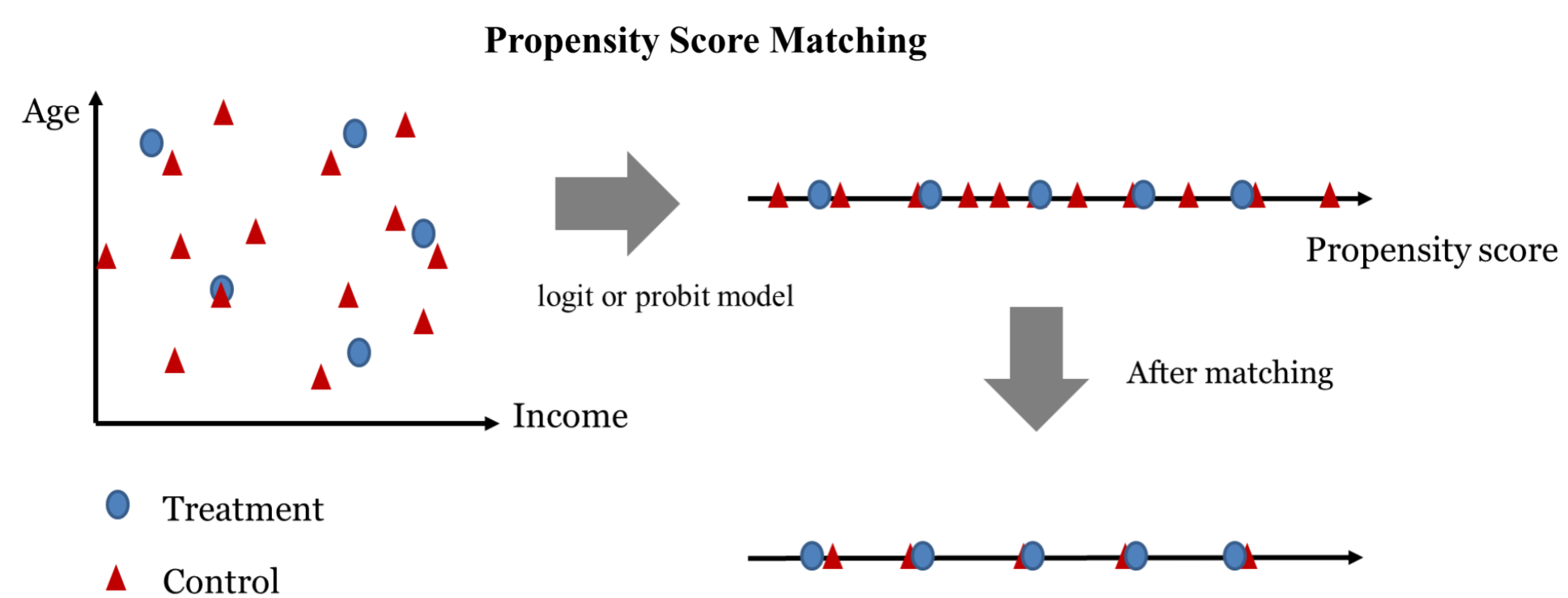 통제 변수가 주어진 상태에서 treatment를 받을 확률을 propensity score라고 한다. treatment 그룹과 control 그룹의 관측치 각각에 대해서 propensity score를 계산하고, 이 값이 비슷한 데이터끼리 매칭하는 방법이 PSM 이다.