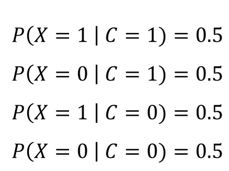 위 그림에서 C는 통제변수, X는 독립변수이고 둘 다 0 or 1 값을 가진다고 가정하자.