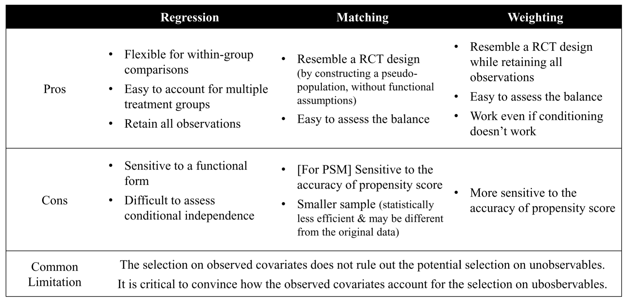 하지만 위 모든 방법들은 관찰된 변수로 selection bias를 통제할 수 있다는 것을 가정으로 한다는 것을 반드시 기억해야 한다. 따라서 관찰되지 않은 변수의 영향력이 적다는 것을 설득력있게 주장하거나, 관찰된 변수들을 이렇게 잘 고려하면 관찰되지 않은 변수들의 영향도 효과적으로 통제할 수 있다는 것을 설득해야 한다. 대부분의 경우 회귀/매칭/웨이팅은 다른 방법론과 함께 사용되는 경우가 많다.
