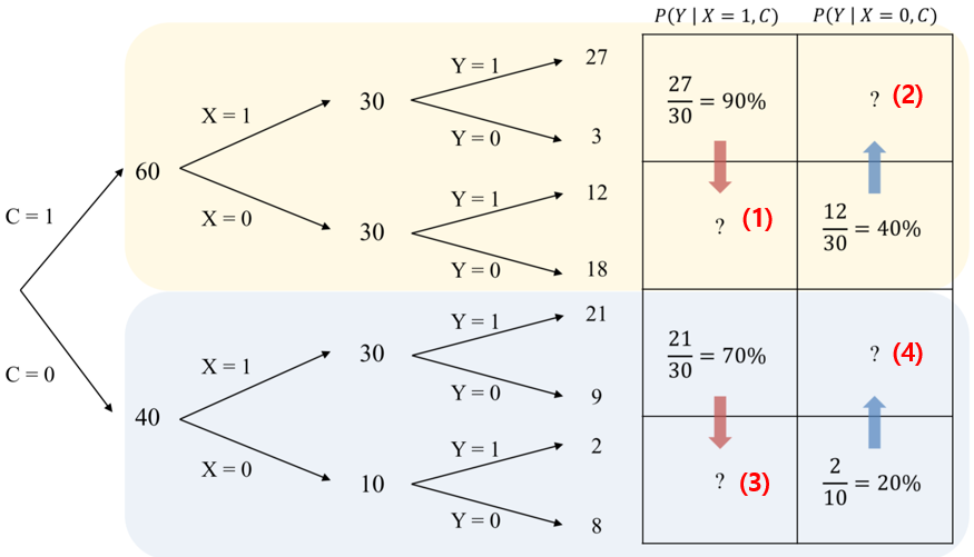 위 그림에서 C는 통제변수, X는 독립변수이고 둘 다 0 or 1 값을 가진다고 가정하자.