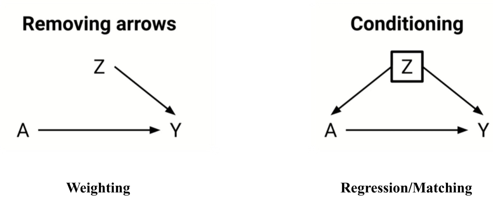 반면 웨이팅은 통제변수와 상관없이 treatment를 받을 확률이 50대50으로 random assignment와 유사한 환경이 되도록 pseudo population을 구성한다. 위 그림에서도 보는 것처럼 통제변수 Z에서 독립변수 A로 가는 화살표를 아예 제거하는 방법이다. 상황에 따라서 conditioning 방식을 사용할 수 없는 경우에는 웨이팅을 사용할 수 있다.
