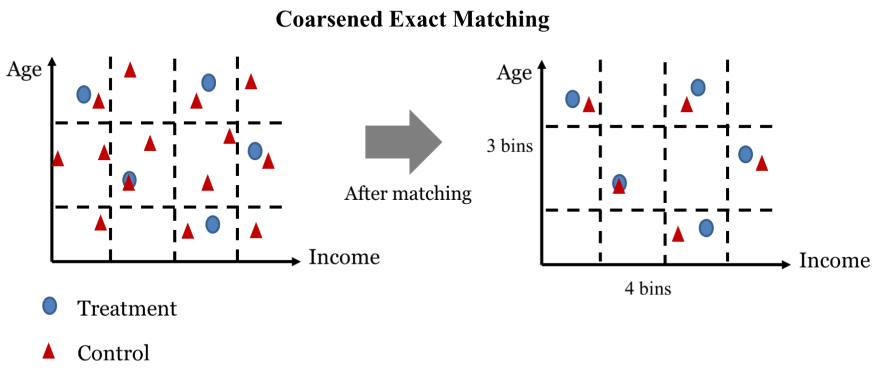 단순하게 통제 변수들이 비슷한 관측치끼리 매칭하는 방법이다. 정확하게 통제 변수가 같은 관측치 쌍을 찾아서 비교하는 것이 이상적이지만 현실적으로 어렵기 때문에, CEM 에서는 몇 개의 구간(bin)으로 나눠서 보다 느슨한 기준으로 비슷한 데이터를 찾아서 매칭한다. 단 CEM은 데이터 샘플의 수가 줄어든다는 단점이 있다