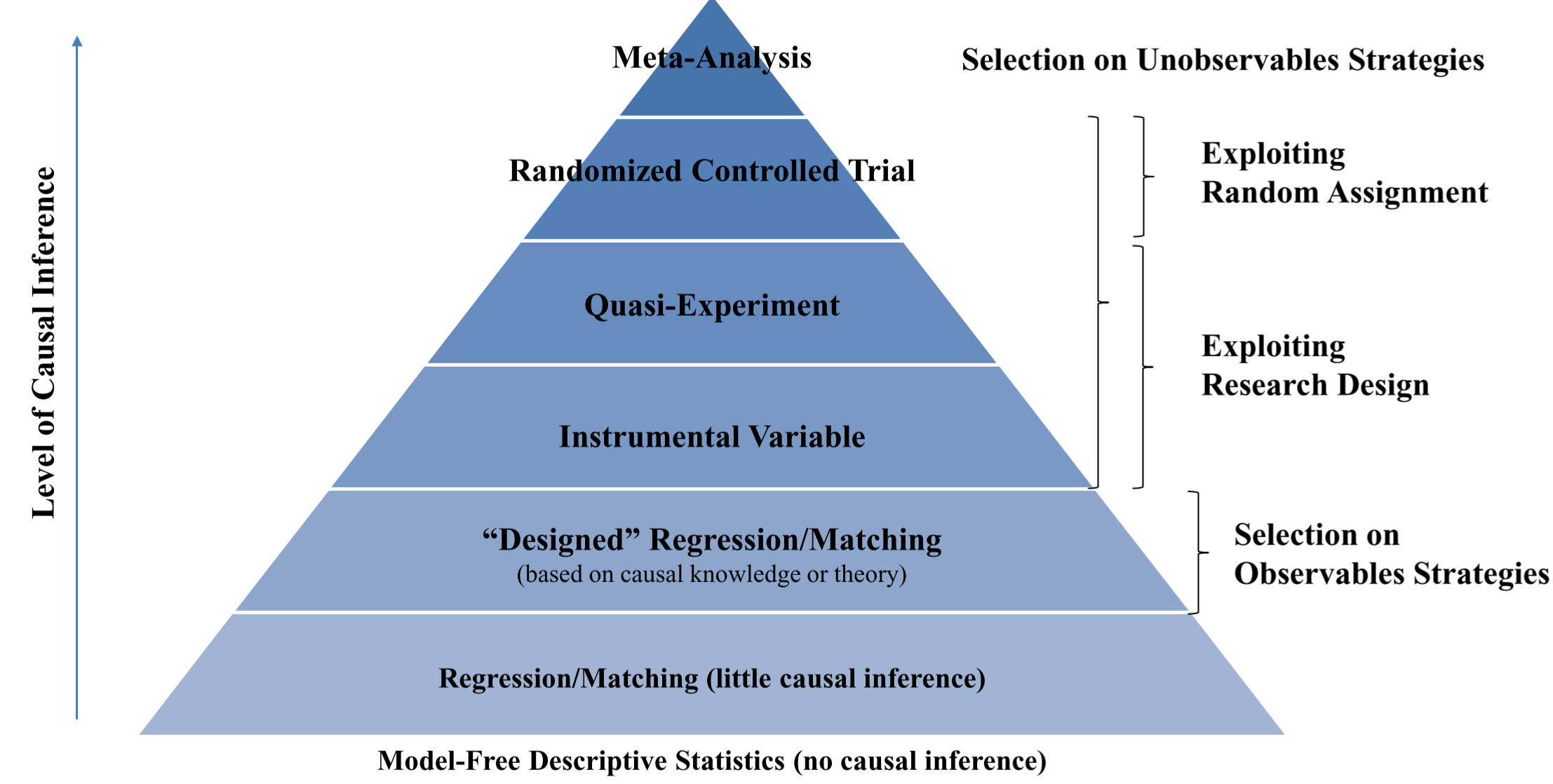 • Regression / Matching 방식은 비교적 인과 추론에서 한계가 많아서 가장 낮은 단계에 있다. 하지만 causal knowledge 또는 적절한 이론을 기반으로 regression / matching을 진행하는 designed regression / matching 은 인과 추론 수준이 한 단계 높다.