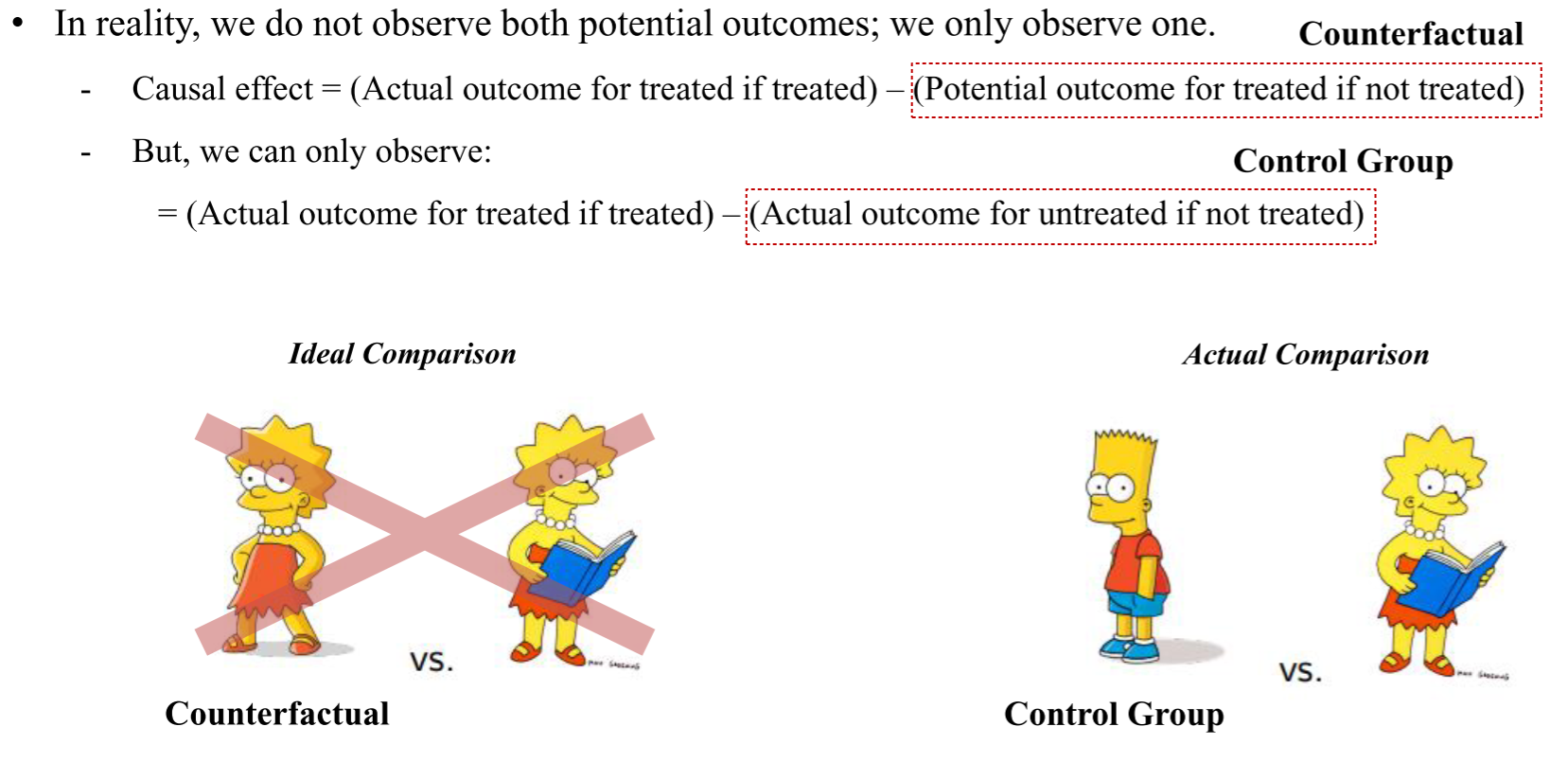 인과관계는 treatment의 효과와, 그것을 받지 않았을 때의 잠재적 결과(Counter factual)의 차이를 의미한다. 하지만 실제로 treatment를 받은 관측치들의 counterfactual 데이터는 관측이 현실에서는 불가능하다. 반대로 treatment를 받지 않은 경우도 treatment를 받은 경우에 대한 데이터(counterfactual)를 수집하는 것이 불가능하다.