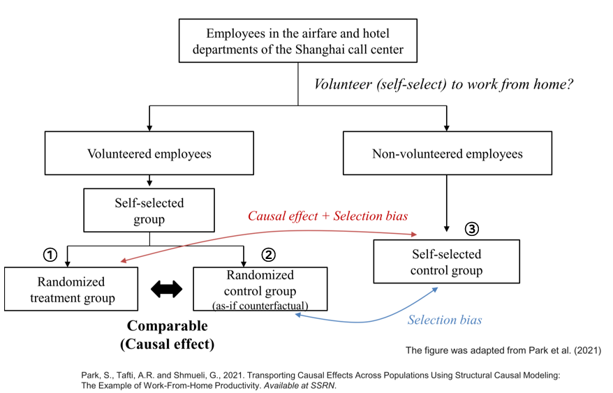 위와 같이 재택 근무 자원자에 따른 차이를 살펴보고자 할 때, 인과관계만 분석하기 위해서는 self-selected group 내에서 다시 랜덤 추출을 진행해야 한다.