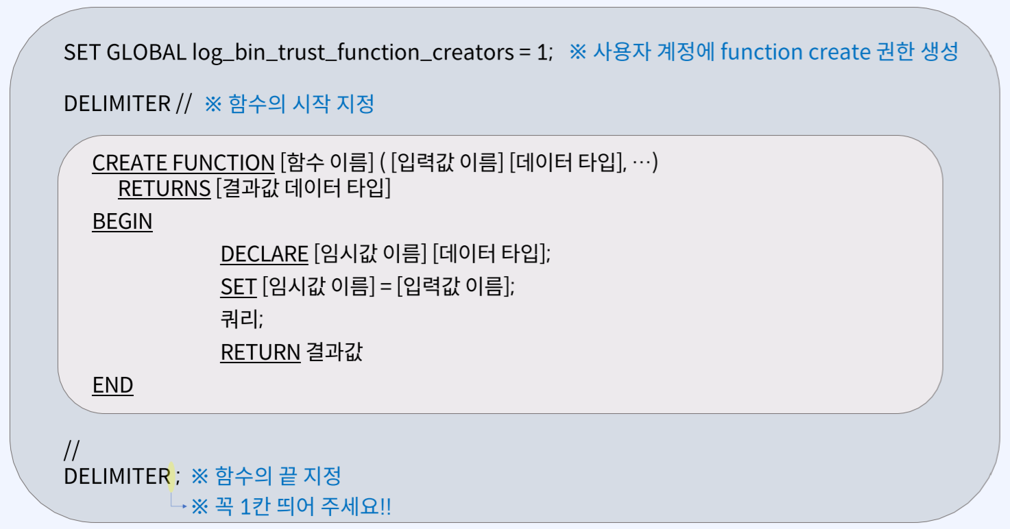 • SQL workbench 에서 함수를 사용할 때에는 위와 같이 앞뒤로 DELIMITER 라는 추가적인 명령어를 입력해야 함