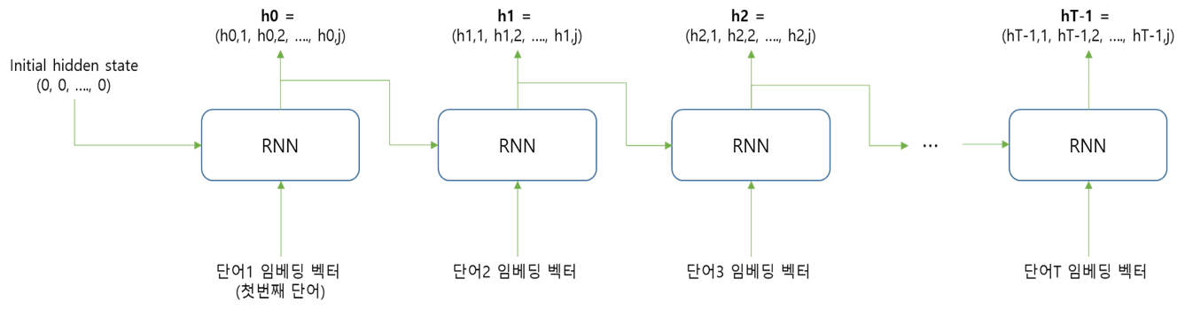 •일반적인 신경망의 은닉층은 한 번만 적용이 되지만, RNN 층은 이전 단계의 히든 벡터를 다시 입력받는 과정을 반복한다.