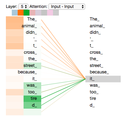 예를 들어, 5번째 self-attention 레이어에서 "it" 과 다른 단어들의 self attention scroe를 살펴보면 붉은색으로 표시된 부분의 값이 높게 나타나고, 이 단어들과 관계가 밀접하다는 것을 알 수 있다.