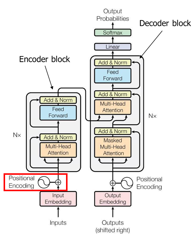 트랜스포머는 512차원의 임베딩 벡터를 사용는데, Positional Encoding 벡터도 동일하게 512차원을 거친다. 첫 번쨰 인코딩 블록에는 임베딩 벡터와 포지셔널 벡터를 더해서(concat이 아니다) 동일하게 512차원으로 계산된 벡터가 입력된다.