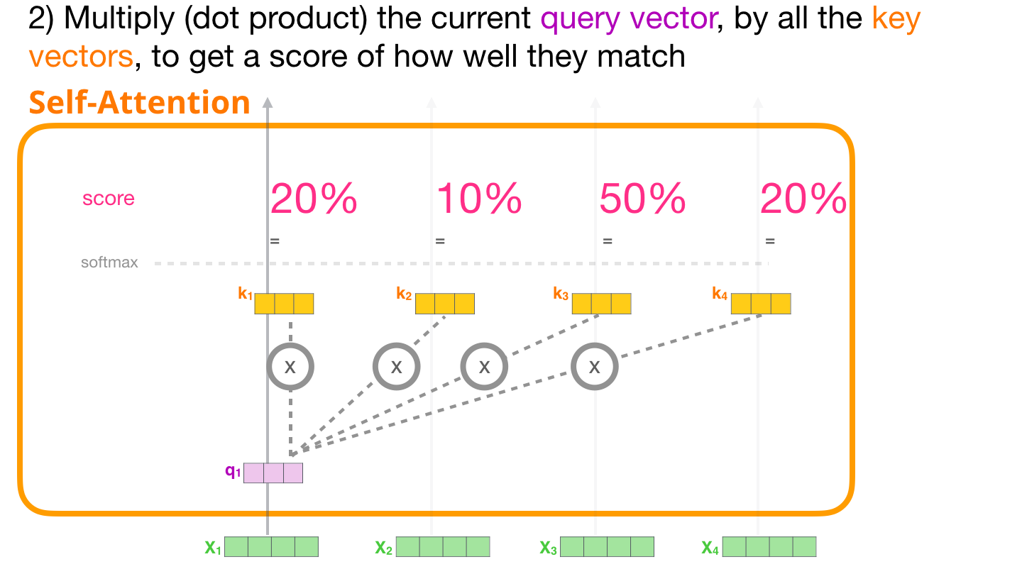 단어 1에 대한 query 벡터와, 단어 1, 2, 3에 대한 key 벡터 사이의 내적 연산을 수행해서 attention score를 계산한다.