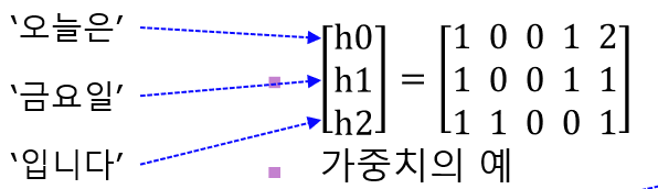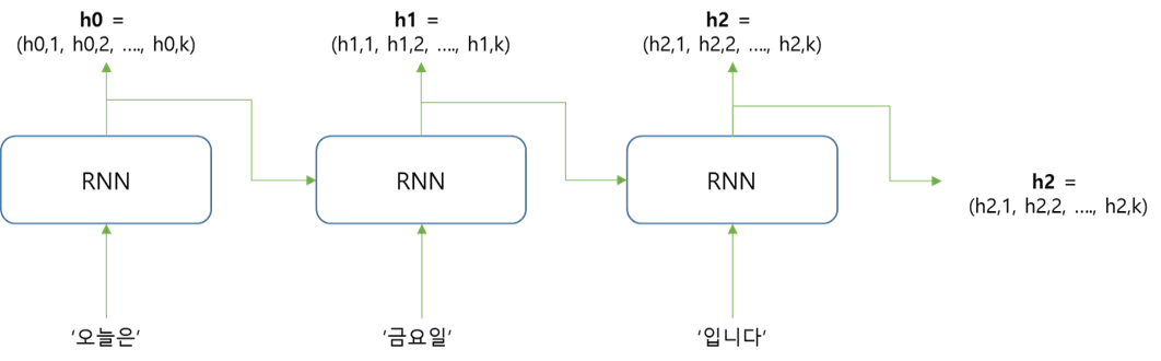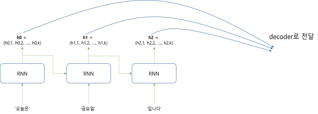 인코더에는 '오늘은', '금요일', '입니다' 에 대한 단어 임베딩 벡터의 정보가 입력되고, 그 결과로 각 단어의 hidden state정보인 h0, h1, h2가 출력된다.