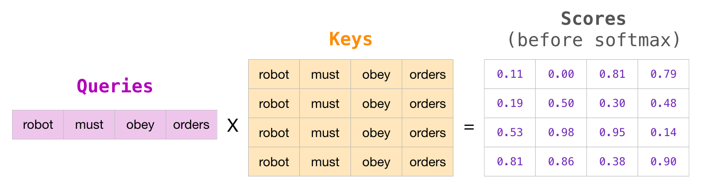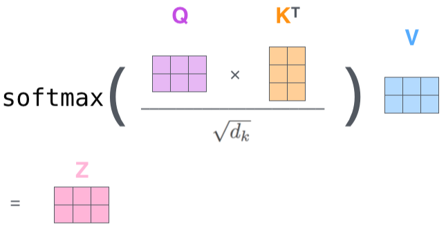 | Q : Query 벡터들에 대한 행렬 K : Key 벡터들에 대한 행렬 V : Value 벡터들에 대한 행렬 KT : K 행렬의 전치행렬 (Transpose) Q와 KT의 곱하기 : Query 벡터들과 Key 벡터들의 내적연산을 의미 |