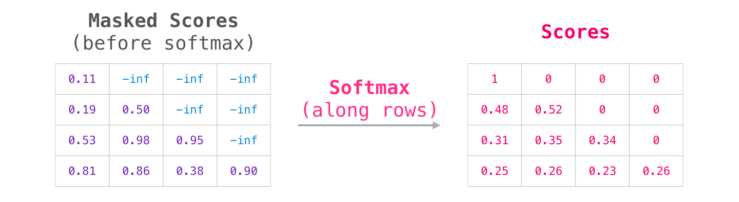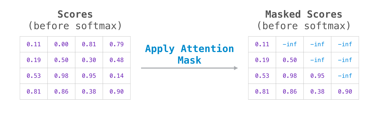 디코더에서는 반드시 자기 앞 쪽에 해당하는 토큰들에 대해서만 attention을 볼 수 있다. 이를 수식으로 반영하기 위해서 디코더에서는 해당 토큰 뒤에 나오는 값에는 모두 -무한대를 할당해서, softmax를 거치면 0이 되도록 설정한다.