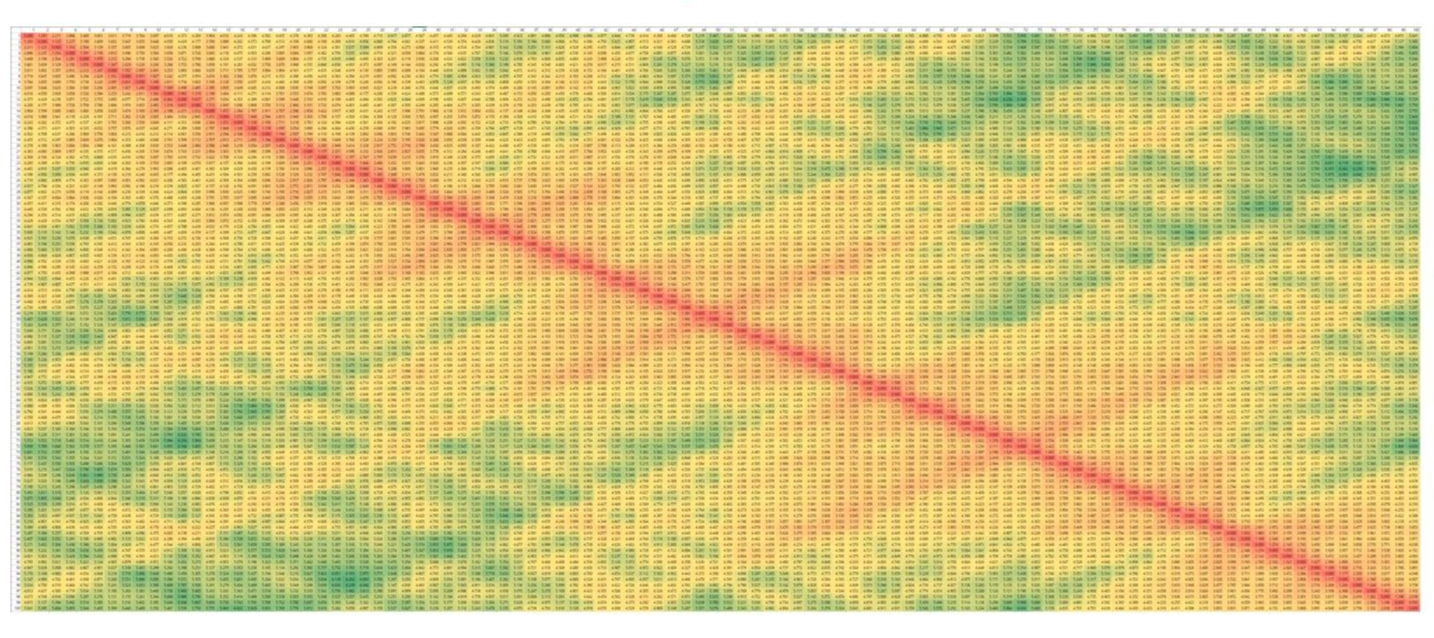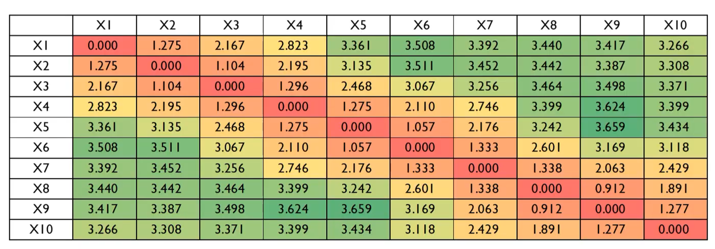 100개의 벡터로 확장해보면, 대각선은 거의 0에 가깝고 멀수록 멀어진다는 것을 알 수 있다. 하지만 일부 부분에서 거리 정보가 역전되는 상황이 발생하기도 한다. 하지만 전반적인 추세는 유지되므로 완벽하지는 않더라도 일정하게 거리 정보를 반영할 수 있다.