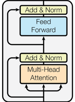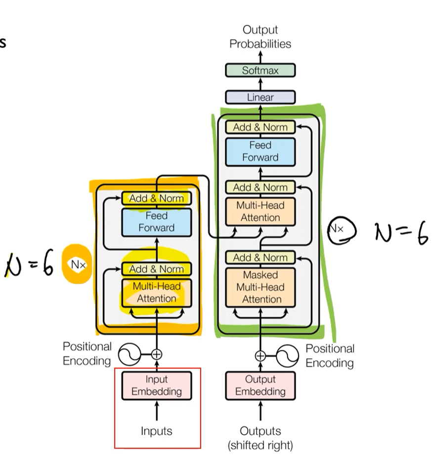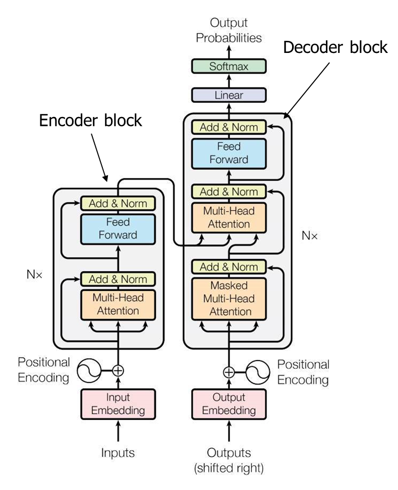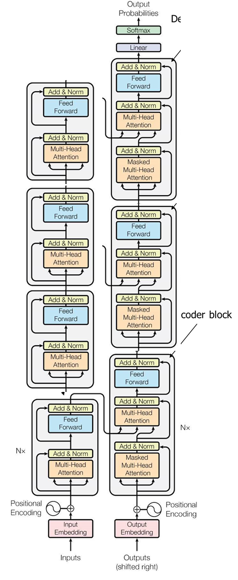 노란색 부분이 인코더 블록, 초록색 부분이 디코더 블록에 해당한다. 실제로는 우측처럼 각 블록이 위로 6개 쌓이는 형태로 구성되어 있다.