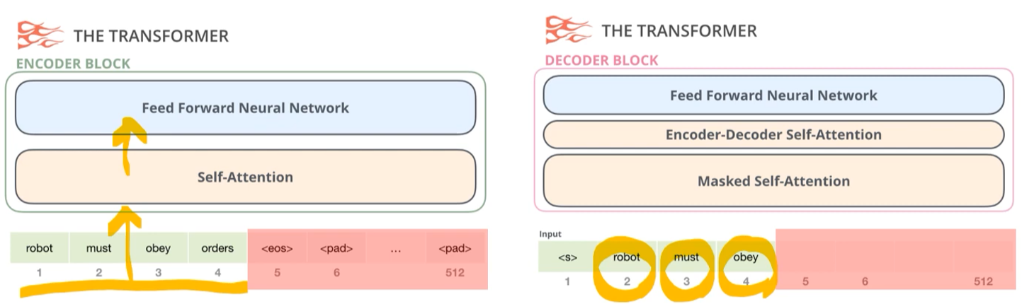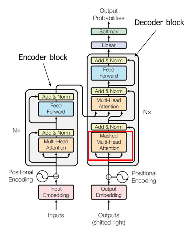 반면 디코딩 블록은 마스킹을 실시하는데 여기서는 orders에 대한 단어가 마스킹 처리되어 있다. 디코딩 블록은 3 단계로 구성되어 있다. 각 블록들은 모두 구조가 위와 같이 동일하지만 구조 내부의 가중치는 학습을 통해서 다르게 결정된다.