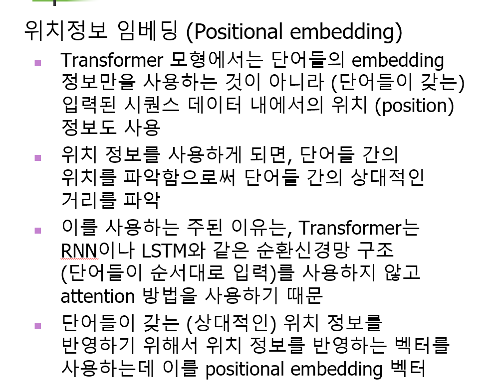 RNN 같은 순환신경망 기반 모델은 순서를 파악하기가 쉽지만, attention 기반의 트랜스포머는 단어 간의 관계는 파악하기 더 유리하지만 단어 간의 순서 정보는 파악하기가 어렵다. 따라서 위치 정보 임베딩을 통해서 순서 정보를 추가하는 것.