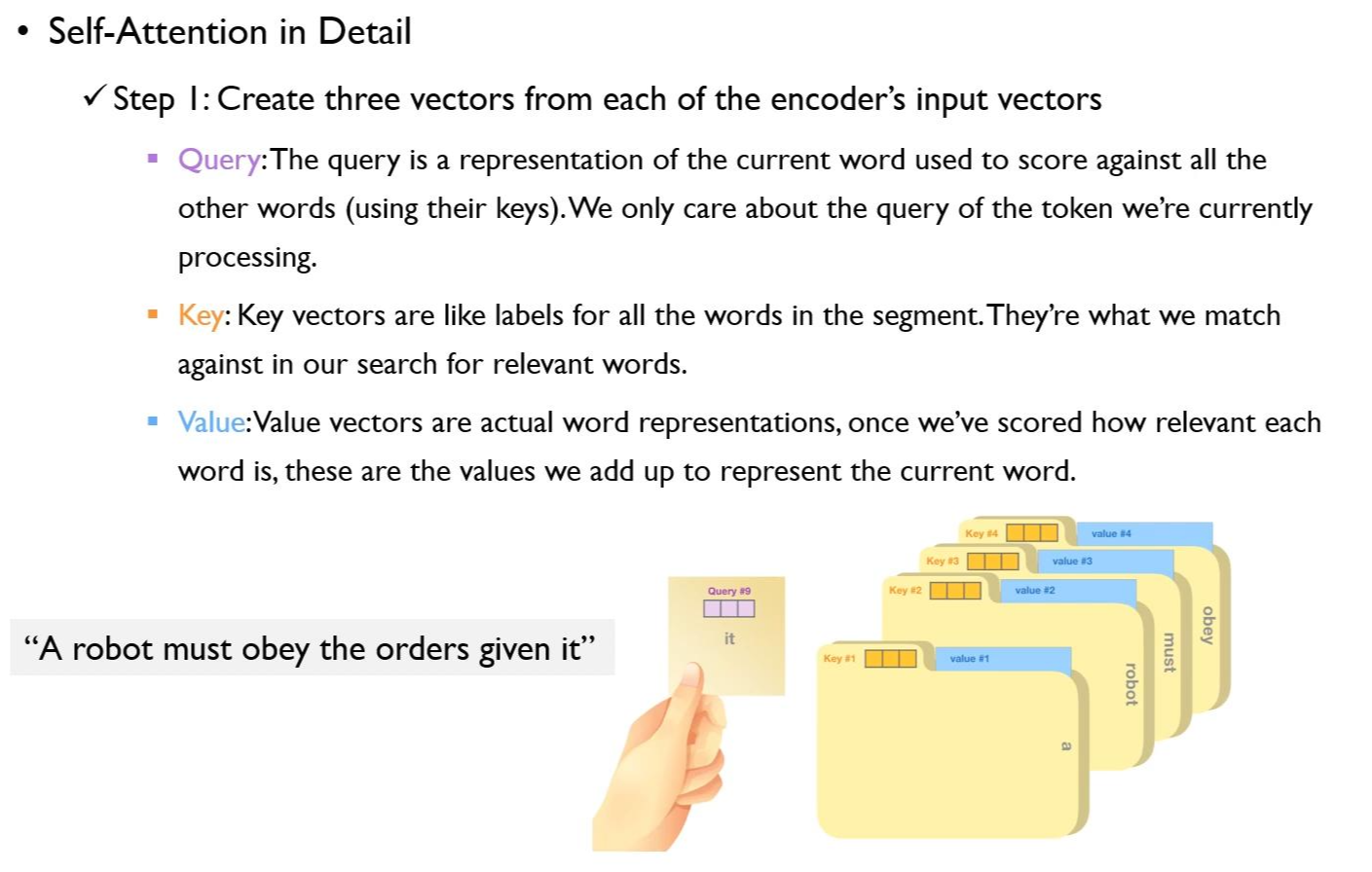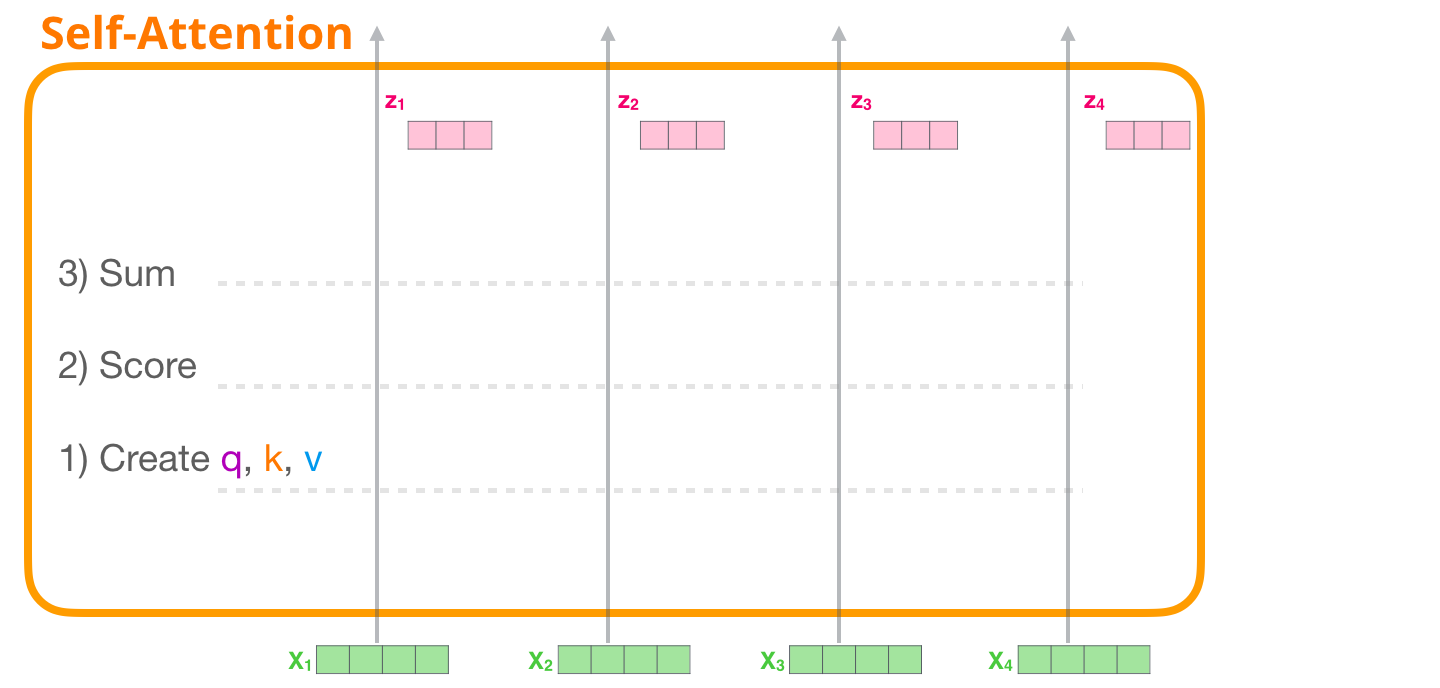 트랜스포머는 임베딩 벡터 의 단어들 간의 관계를 self-attention으로 계산한다. 이 과정에서Query, Key, Value 형태의 서로 다른 3개의 벡터를 생성해서 사용한다.