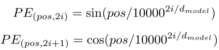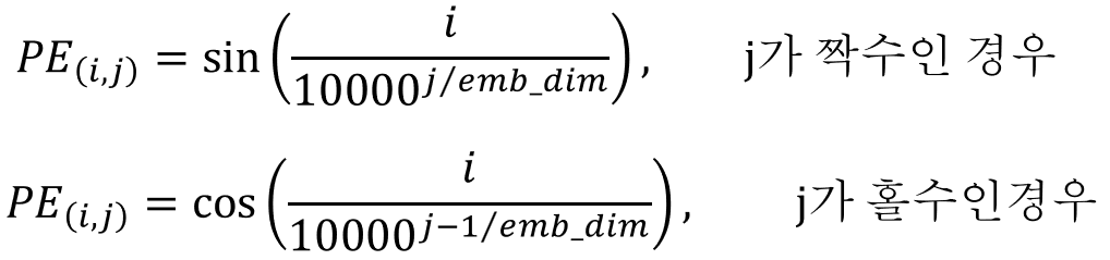위치정보를 계산하는 식은 j 가 짝수/홀수인 경우에 따라서 달라진다. PE(i,j)는 단어 i의 positional embedding vector의 위치 j의 원소값을 의미한다.