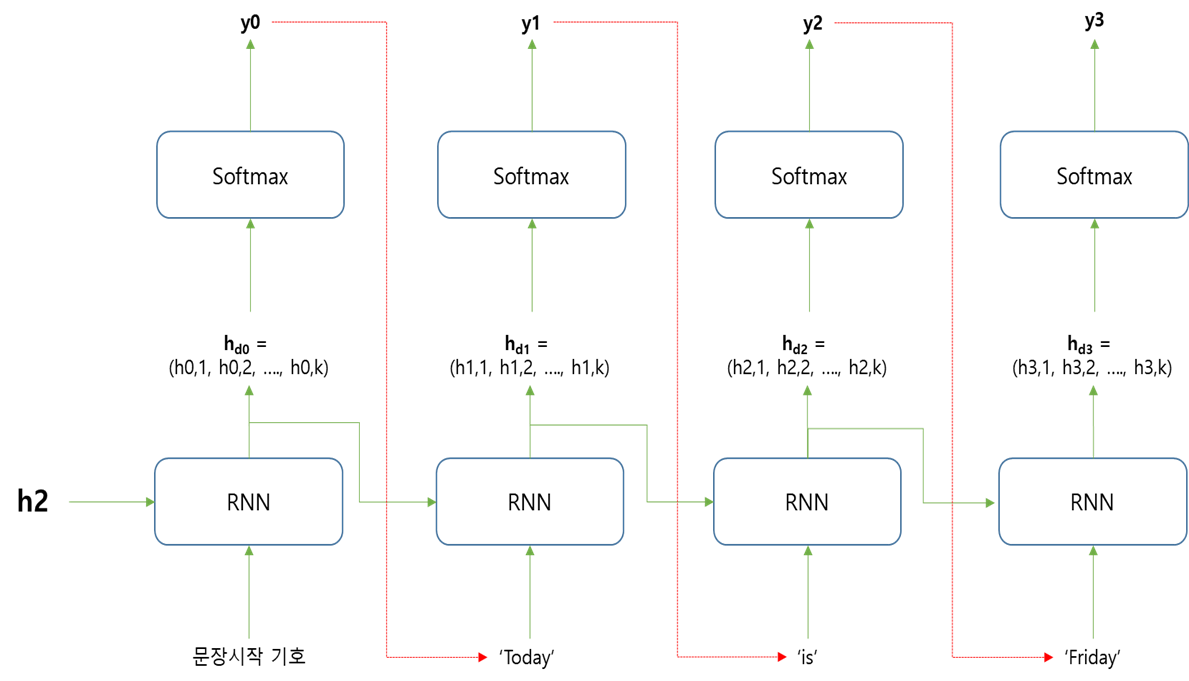 위의 RNN 신경망 전체를 하나의 인코더로 볼 수 있다. 최종적으로 출력하는 h2 값이 디코더로 전달된다.