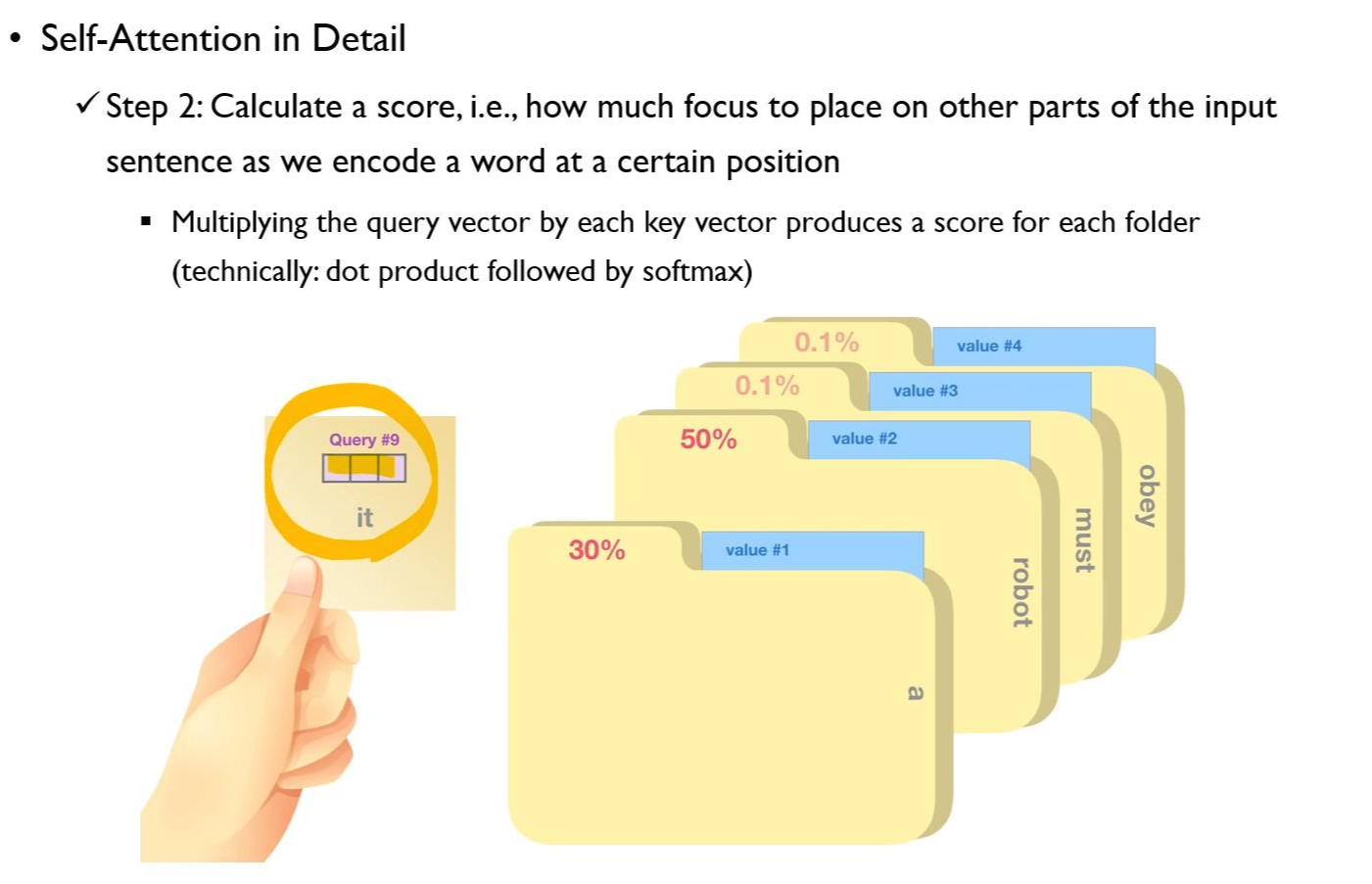 여러 개의 폴더 중에서 현재 내가 관심을 가지고 계산하고 있는 input의 토큰 "it" 이라는 단어와 유사한 폴더를 찾는다. 구체적으로 이를 찾는 계산과정은 다음과 같다.