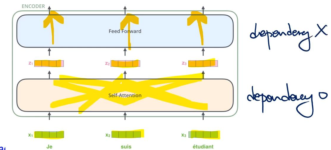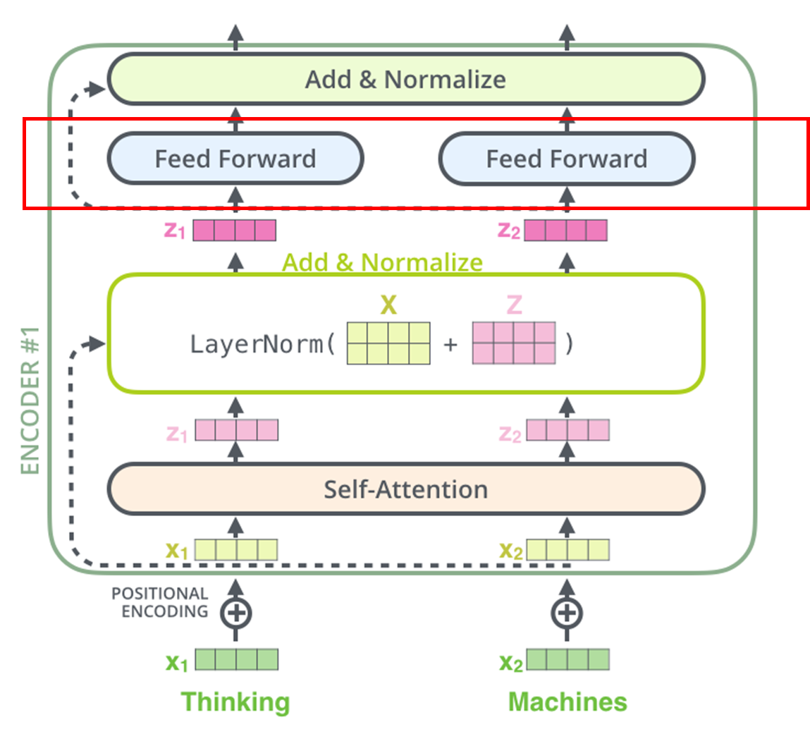 시퀀스로 입력되는 각 단어에 대한 Input vector는 self-attention을 통해서 그대로 path를 통과하면서 포지션이 유지된다. 그리고 이것이 그대로 FFN으로 입력된다. self-attention 내에서는 각 벡터가 서로 dependency가 있어서 영향을 미치지만, FFN으로 입력된 이후로는 서로 간섭 없이 직선으로만 전달된다.