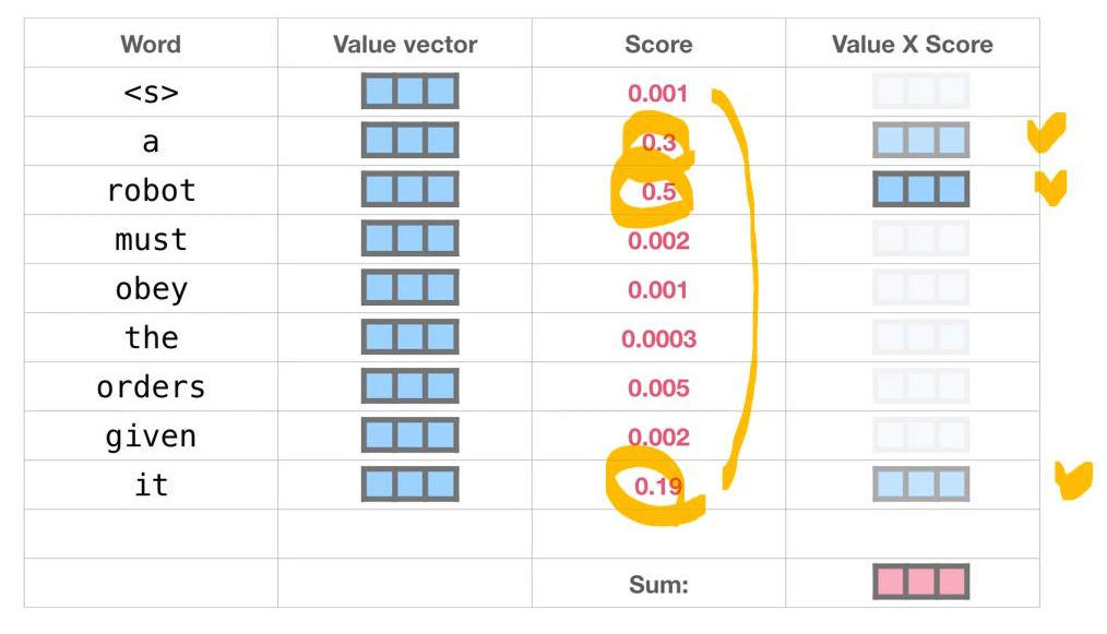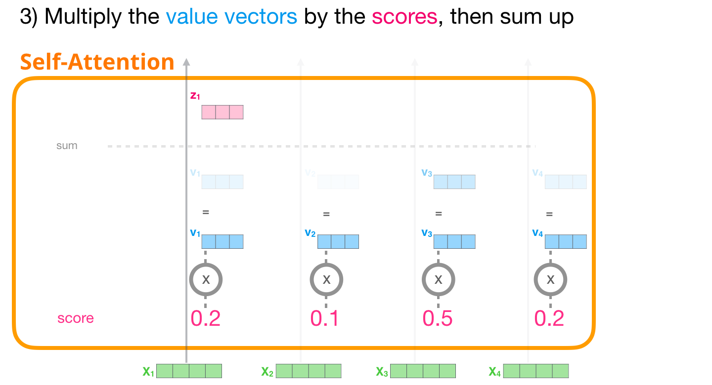각 input token의 value 벡터는 softmax 스코어와 곱해지고, 그 결과 가중치가 높은 input token의 정보가 더 많이 남아있게 된다. self-attenion의 최종 output은 value x score의 값을 모두 더한 붉은색 벡터 이다.
