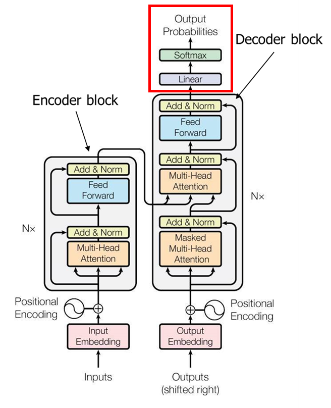 디코더 블록에서는 최종적으로 숫자로 된 벡터가 전달된다. 따라서 이를 최종적으로 특정 단어로 반환할 필요가 있다.
