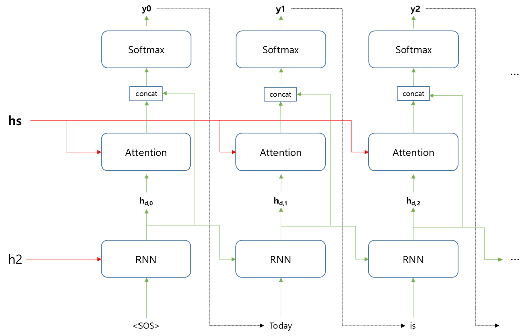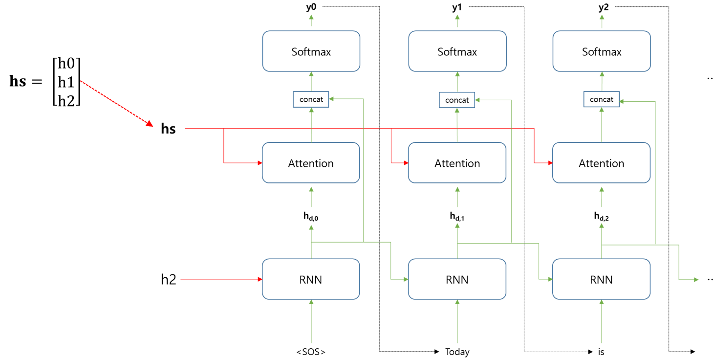 그리고 최종적으로 Attention 에서 출력하는 값과, RNN층에서 출력하는 값(hd,0)을 concat 해서 전달한다.