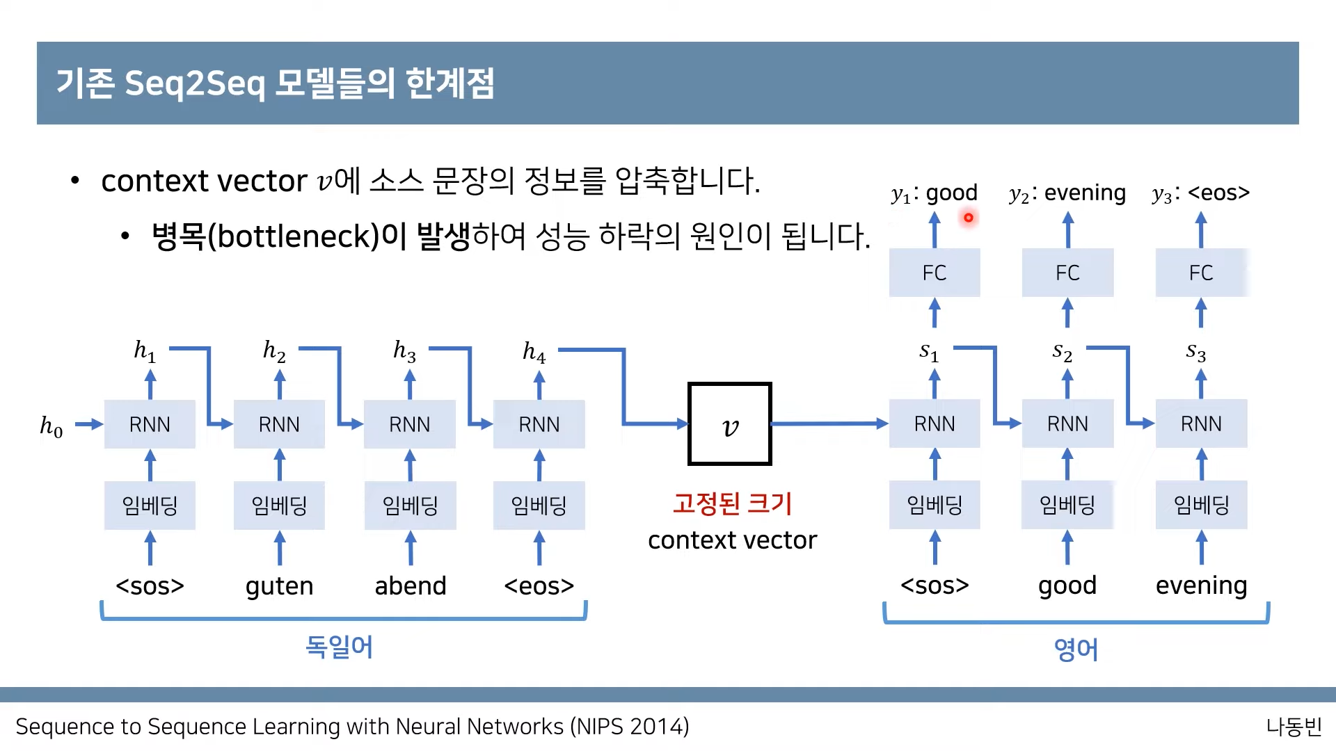 즉, 하나의 고정된 벡터 v에 입력된 문장의 정보가 모두 입력되어야 하므로 성능이 저하된다.