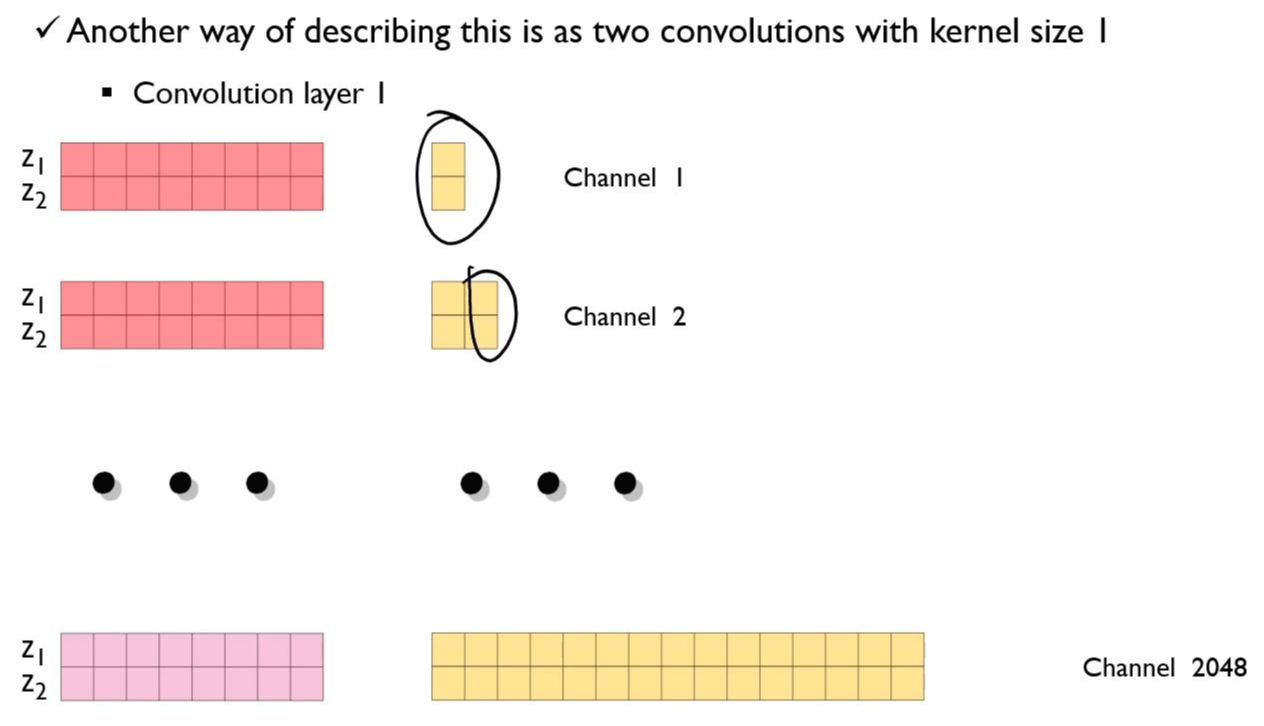 z1, z2에 대해서 채널=2048, kernal size=1 인 경우로 보고 합성곱 연산을 수행할 수 있다. 위에서 수행한 2번의 연산을 총 2048번 수행하게 되면, 아래와 같이 총 2048개의 노란색 벡터를 만들 수 있다.