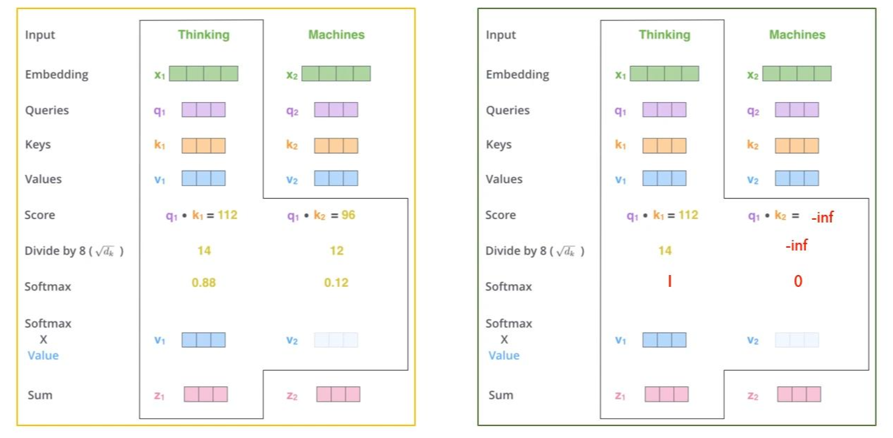 따라서 우측에서는 Thinking 이라는 단어에 대해서 계산을 할 때, 오른쪽에 있는 Machine에 대해서는 예측을 하지 않고 앞 쪽의 단어만을 사용한다.