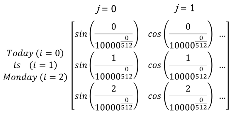 예를 들어, ['Today', 'is', 'monday'] 라는 위치정보 임베딩 벡터를 512차원의 벡터로 나타내는 경우 아래와 같이 계산된다.
