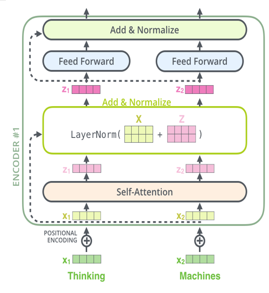 정규화에는 Layer Normalization이 사용되고 이 과정을 거쳐서 FNN으로 전달된다. 이러한 Add&Normalize는 모델의 여러 부분에 반복적으로 사용되어 성능을 향상시킨다. 위 그림에서도 self attention에서 출력된 Z 값과 원래 X 값이 그대로 concat 된 이후에 정규화가 실시되는 것을 확인할 수 있다.