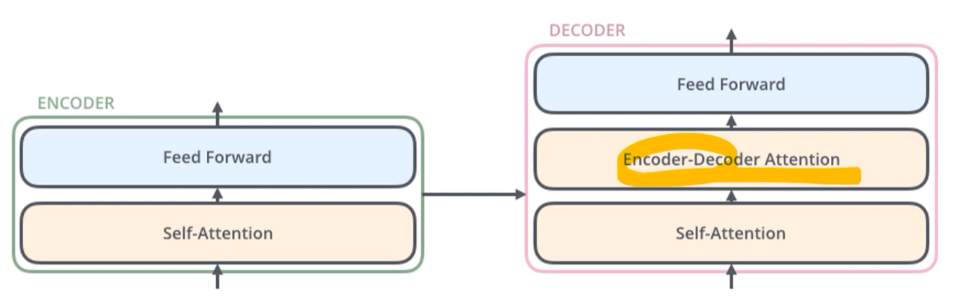 디코더 부분에서는 self attention이 아니라 인코더에서 넘어온 값을 이용한 encoder-decoder attention이 사용된다.