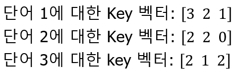 (해당 단어의 임베딩 벡터) X (key 가중치 행렬) = key 벡터