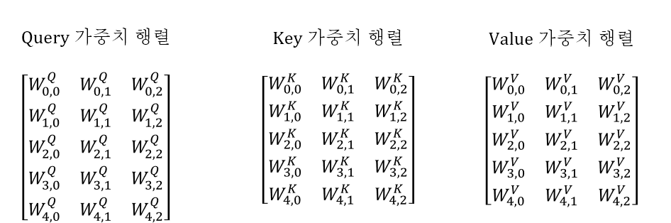 Q, K, V 벡터의 크기를 맞추기 위해서는 가중치 행렬이 5x3 형태가 되어야 한다.