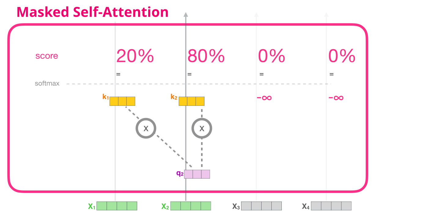 즉, x1~x4 로 4개의 단어 벡터가 입력되었을 때, x2 기준에서 보면 나중에 들어온 x3, x4의 key, value는 사용하지 않는다.