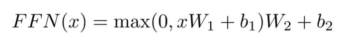 FFN내부에서는 ReLu 활성화 함수가 사용된다. 0과 전달된 x 값중에 큰 것을 선택하고, 여기에 가중치를 곱하고 편향을 더한다.