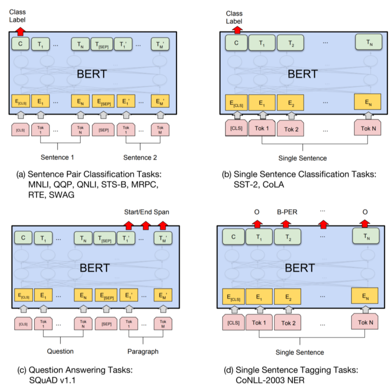 BERT 구조 위에 레이어를 추가하면 다양한 종류의 TASK를 수행할 수 있다.