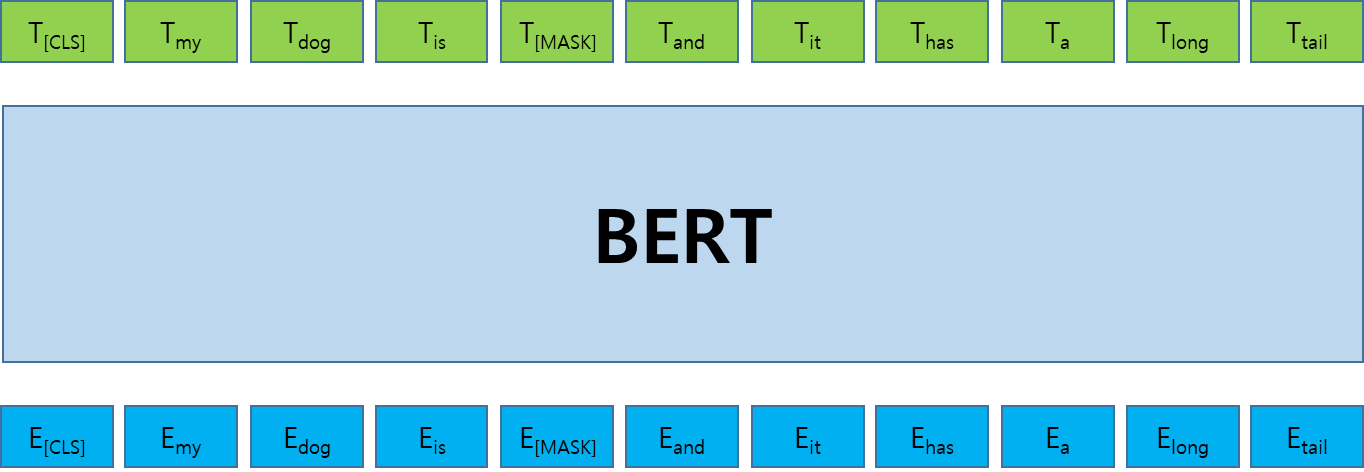 hairy 라는 단어를 마스킹한다고 할 때, 위와 같이 진행된다. 여기서 apple은 랜덤 토큰으로 전혀 상관없는 의미의 토큰이 들어온다.